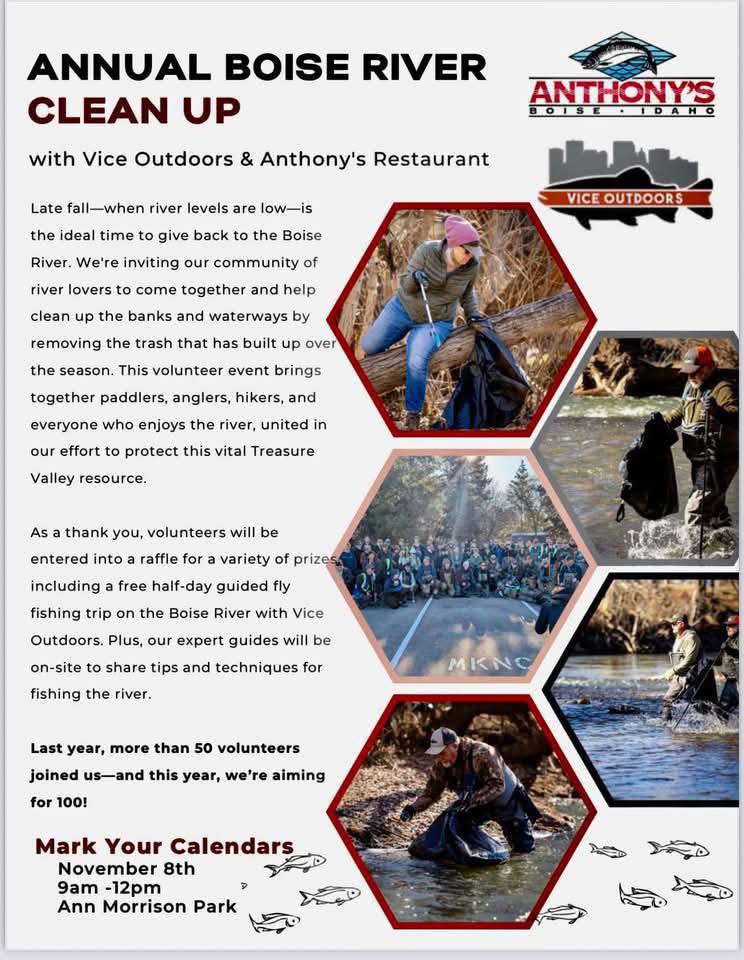 We are joining Vice Outdoors and Boise Valley Fly Fishers for a river cleanup on November 2nd at 9am at Ann Morrison Park. WFFI has always had good representation at the river clean-ups, so mark your calendar for this event. It’s a great way to give back to the community plus it’s a lot of fun! Feel free to bring family and friends…many hands make for light work.